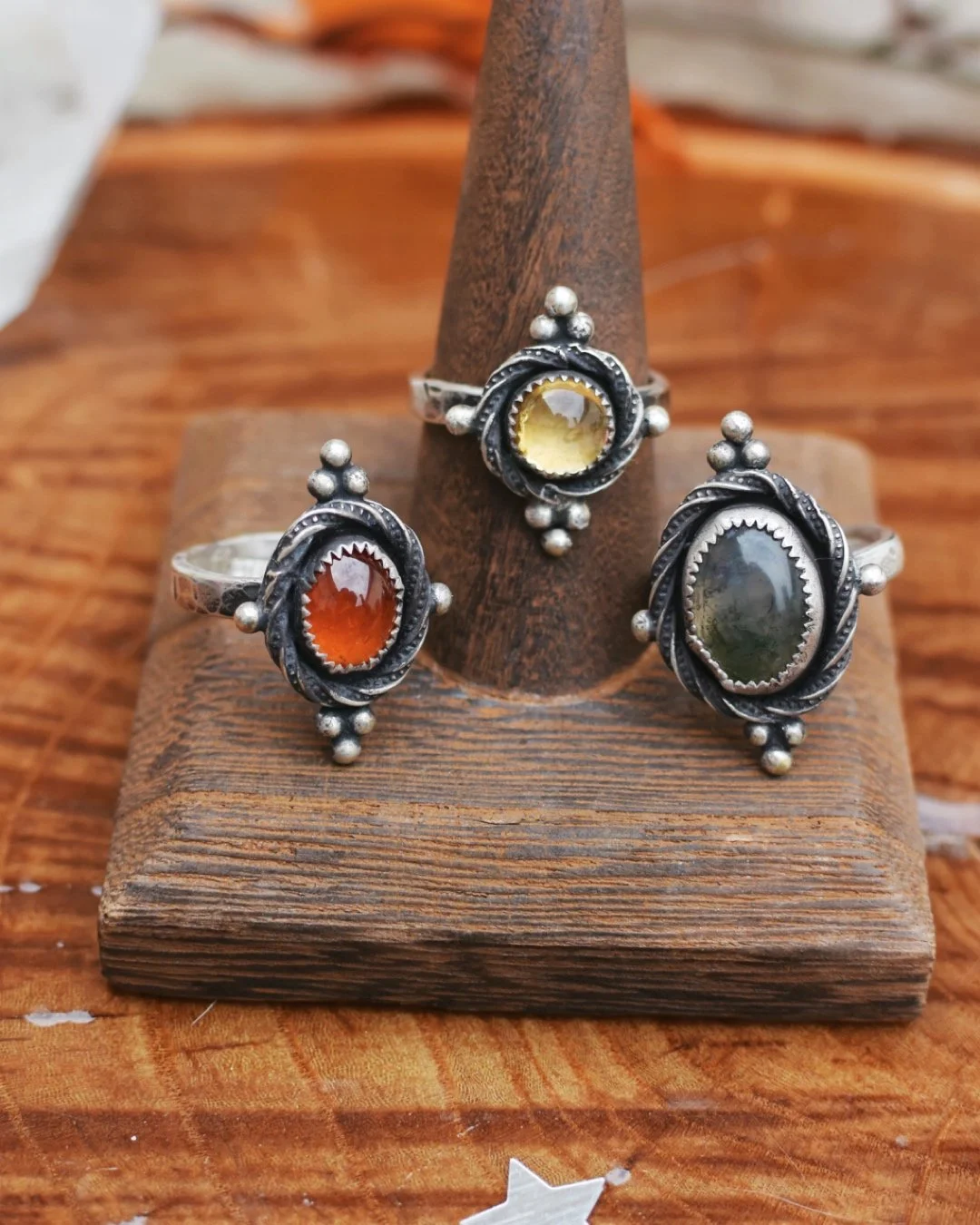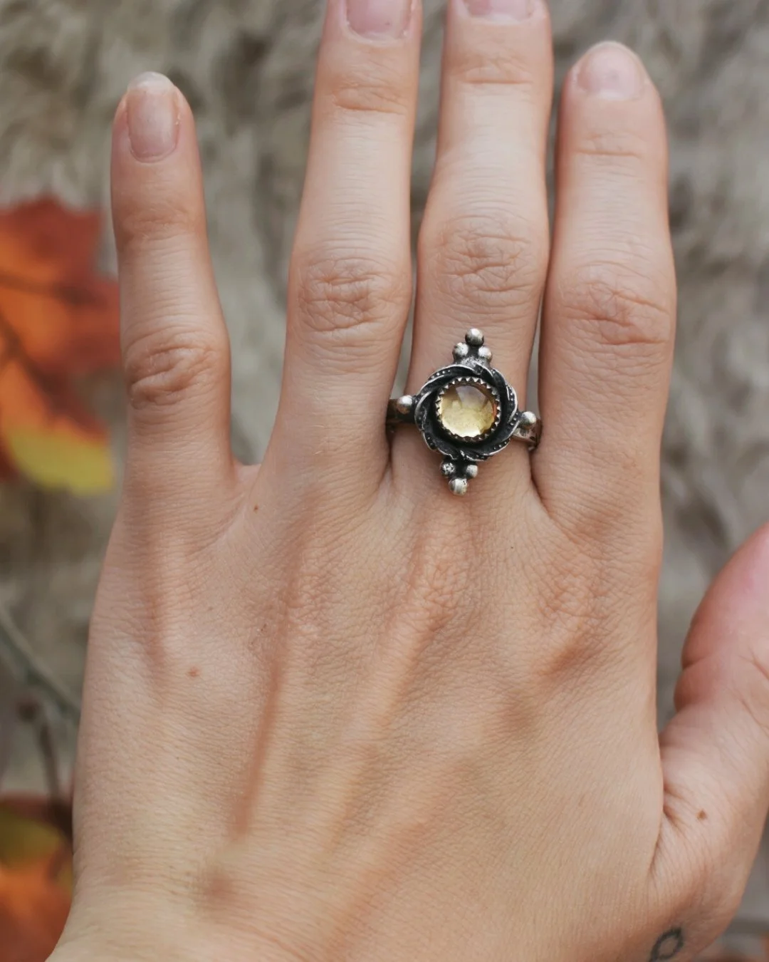 At its heart, a brilliant yellow citrine gemstone, like a burst of sunshine, takes center stage. Encircled by a frame of meticulously twisted silver wire, the citrine is cradled with elegance and precision. The ring is adorned with ornate silver orbs that add a touch of whimsical charm, reminiscent of celestial bodies in orbit.