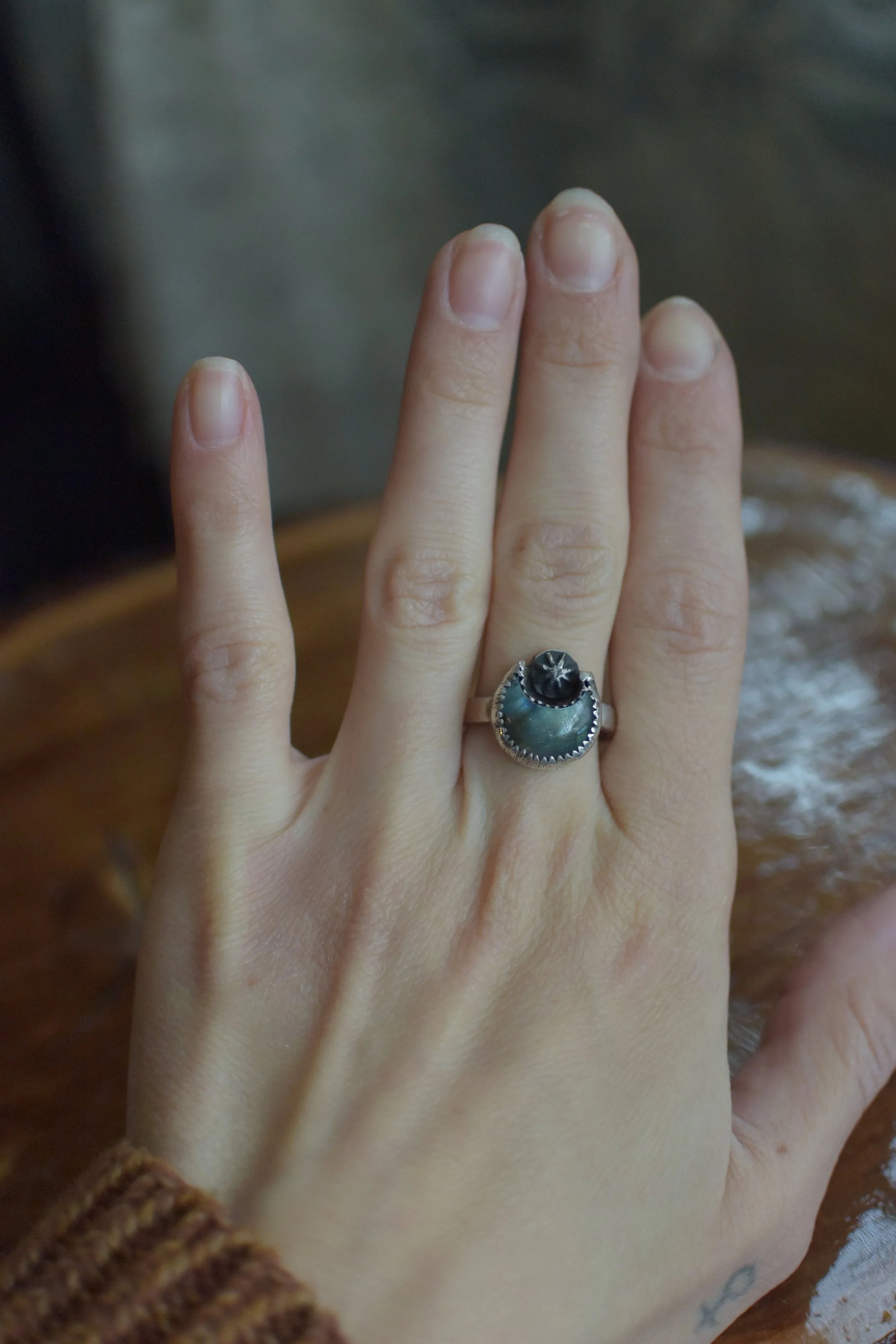 Elevate your style with this charming sterling silver ring, showcasing a radiant blue labradorite embedded in an exquisite filigree band.